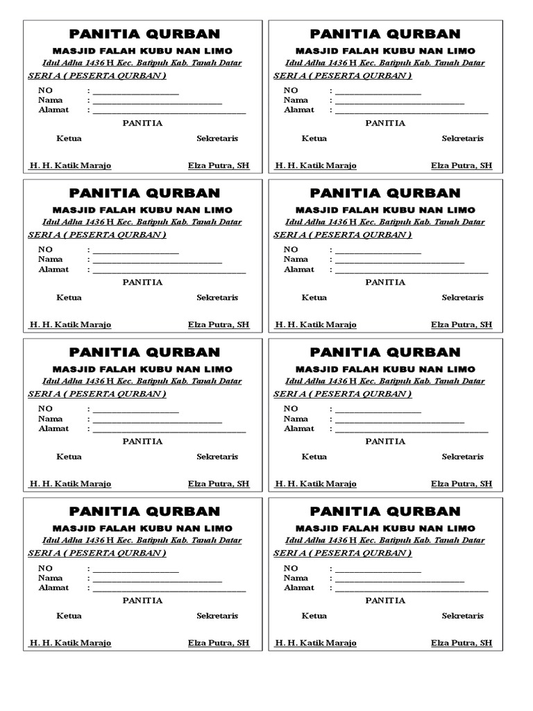 Penulis ary setyobudi diterbitkan september 26, 2015. Juni 23, 2021 tidak ada komentar design template panitia qurban terbaru 2021. Pengurus atau panitia hari besar ini wajib mengenakan kartu tanda pengenal panitia kurban saat bertugas, sebab kartu tersebut memiliki beberapa fungsi penting yaitu: Konsep terbaru desain spanduk bakso bakar. Mn kan lh thbh ythbhh fetha ahl hlal th. Contoh stempel panitia qurban terbaru 2021 stempel panitia masjid idul adha 2021 format desain stempel siap edit di 2021 kartu nama brosur kartu. 55+ desain stempel siap edit. Contoh design stempel panitia qurban iedul adha contoh sumber : Contoh desain kupon qurban contoh kupon pembagian hewan qurban dalam perayaan hari raya idul adha ini dibuat di coreldraw x7 namun admin simpan dengan versi lebih rendah yakni coreldraw x4. Penyembelihan qurban dan selembar kupon qurban umumnya dilengkapi nomor keterangan cap atau stempel panitia qurban. Jika di daerah anda terdapat masjid yang sudah rusak atau memang belum terdapat masjid yang dibangun di daerah anda. Akan kami ulas pada kesempatan berikutnya. Design template stempel panitia qurban terbaru 2021 ukuran stanndar bulat 3 x 3 cm.